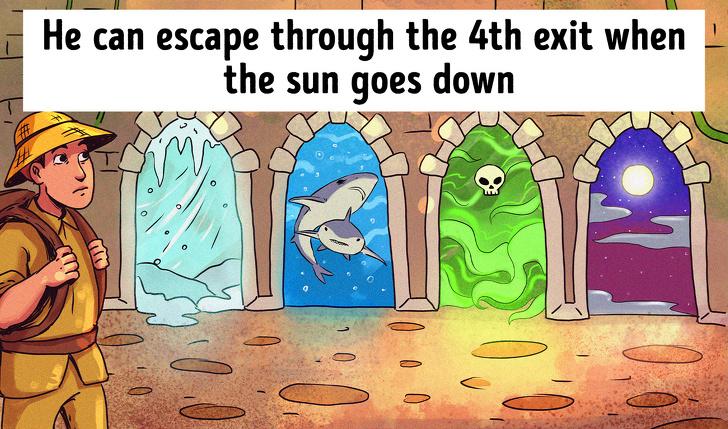 10. Πώς θα μπορούσε να δραπετεύσει; Ένας άντρας απήχθη και κλειδώθηκε σε ένα σπίτι. Το σπίτι είχε 4 πόρτες και θα μπορούσε να ξεφύγει από μία από αυτές. Πίσω από την πρώτη πόρτα υπάρχουν πολύ χαμηλές θερμοκρασίες που θα τον παγώσουν μέχρι θανάτου. Υπάρχουν πολύ πεινασμένοι καρχαρίες πίσω από τη δεύτερη πόρτα. Το δωμάτιο πίσω από την τρίτη είναι γεμάτο δηλητηριώδες αέριο. Το τέταρτο έχει έναν τόσο ισχυρό ήλιο που καίει τα πάντα. Πώς μπορεί να δραπετεύσει;