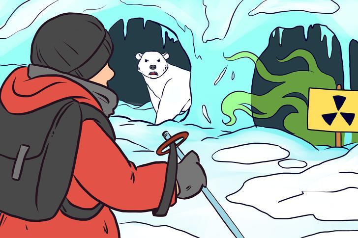 3. Ποια διαδρομή θα έπρεπε να επιλέξει; Ένας άντρας εξερευνούσε τον Νότιο Πόλο όταν ξεκίνησε μια δυνατή καταιγίδα. Κατάφερε να βρει 2 σπηλιές όπου θα μπορούσε να βρει καταφύγιο, αλλά παρατήρησε μια πεινασμένη πολική αρκούδα σε μια σπηλιά και η άλλη είναι γεμάτη από ραδιενεργά απόβλητα. Ποια σπηλιά πρέπει να επιλέξει;
