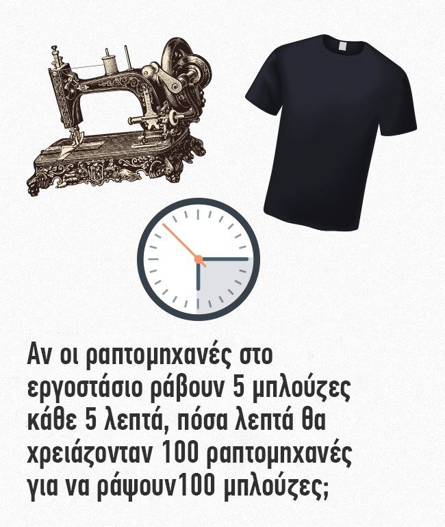 8. Η σωστή απάντηση είναι 5 λεπτά. Εάν 5 μηχανές ράβουν 5 μπλουζάκια σε 5 λεπτά, όσο περισσότερες μηχανές έχουμε, τόσο περισσότερα μπλουζάκια θα ράψουμε. Αλλά ο χρόνος δεν θα αυξηθεί.
