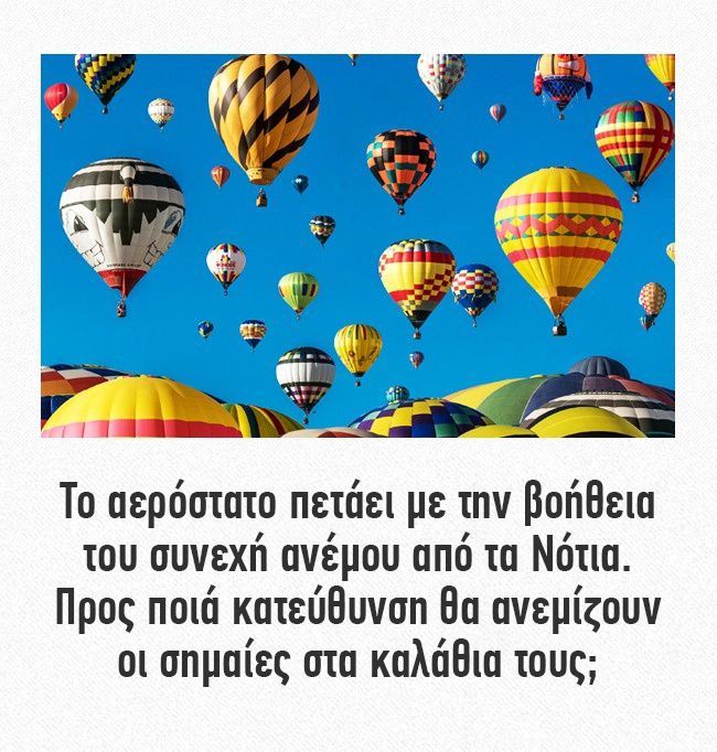 6. Ένα αερόστατο πετάει με τη δύναμη του ανέμου, αλλά βρίσκεται σε ηρεμία σε σχέση με τον αέρα. Αυτός είναι ο λόγος για τον οποίο οι σημαίες δεν πρόκειται να κυματίζουν προς οποιαδήποτε κατεύθυνση – θα κρέμονται σαν να μην υπήρχε καθόλου άνεμος.