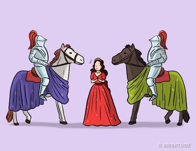Μια φορά κι έναν καιρό, ένας βασιλιάς ήθελε να βρει έναν σύζυγο για την κόρη του και κανόνισε ένα τουρνουά με ιππότες. Οι υποψήφιοι έπρεπε να υπομείνουν πολλές προκλήσεις, και στο τέλος, έμειναν μόνο δύο άνδρες. Για να αποφασίσει ποιος θα παντρευτεί την κόρη του, ο βασιλιάς διέταξε τους ιππότες να οδηγήσουν τα άλογά τους στη λίμνη. Αυτός που θα έφτανε τελευταίος θα έπαιρνε την πριγκίπισσα. Οι ιππότες ετοίμασαν τα άλογά τους και οδηγούσαν πολύ αργά προς τη λίμνη. Τους πήρε μια εβδομάδα, καθώς κανένας από αυτούς δεν ήθελε να είναι ο πρώτος. Τελικά, κατέβηκαν από τα άλογα, κάναν μια χειραψία αποχαιρετισμού και αποφάσισαν να πάνε σπίτι. Αλλά τότε η πριγκίπισσα ήρθε σε αυτούς και ψιθύρισε κάτι στα αυτιά τους. Οι ιππότες πήδησαν στα άλογα τους και έσπευσαν στη λίμνη. Τι είπε η πριγκίπισσα;