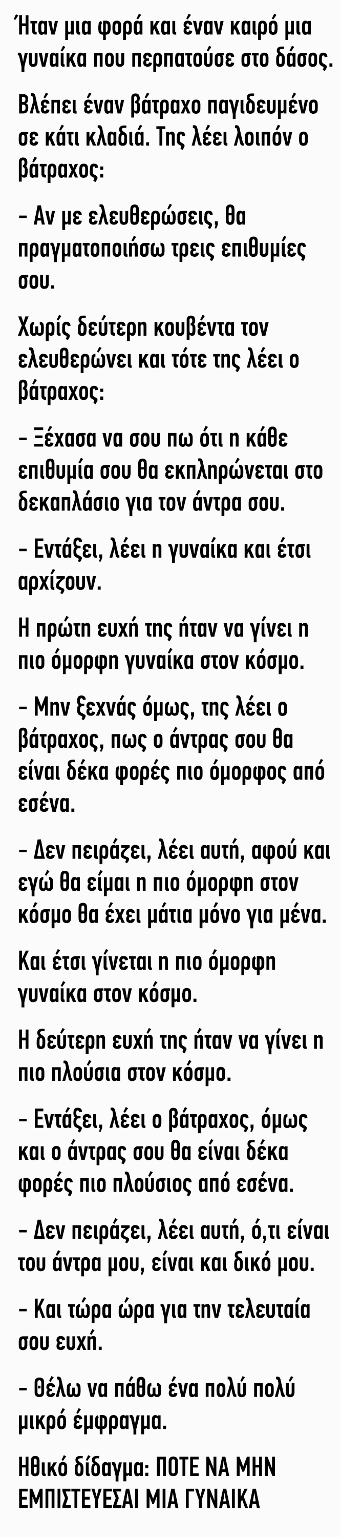 – Εντάξει, λέει ο βάτραχος, όμως και ο άντρας σου θα είναι δέκα φορές πιο πλούσιος από εσένα. – Δεν πειράζει, λέει αυτή, ό,τι είναι του άντρα μου, είναι και δικό μου. – Και τώρα ώρα για την τελευταία σου ευχή.