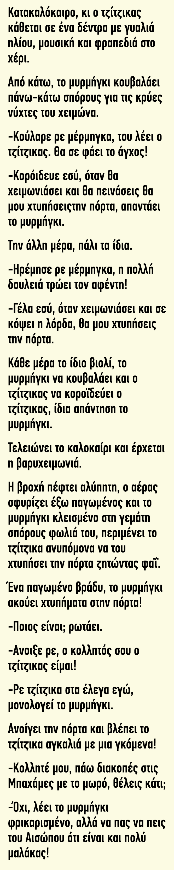 Ανέκδοτο-Κατακαλόκαιρο ένας τζίτζικας κάθεται σε ένα δέντρο με γυαλιά ηλίου…