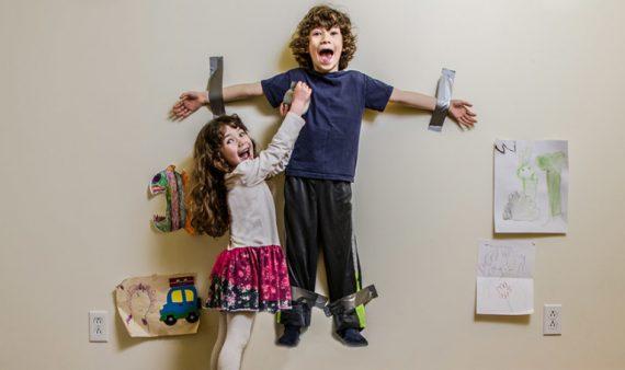 Λίγα λεπτά αργότερα, βρήκαμε την ανηψιά μου να έχει κολλήσει τον αδερφό της στον τοίχο, λίγο πάνω απ’ το έδαφος, με την ταινία που βρήκε στα εργαλεία του μπαμπά της. Όταν τη ρωτήσαμε τι κάνει, κάπως αυστηρά, μας είπε πως ήθελε να τον κάνει κορνίζα! Γελάσαμε και τον κατεβάσαμε πριν κατέβει μόνος του απ’ το… βάρος.