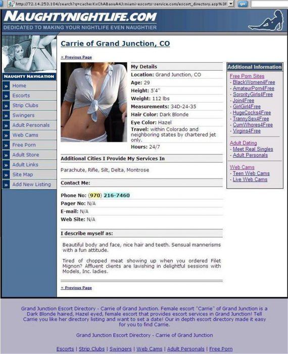 Επιπλέον, στον ιστότοπο Naughtynightlife.com διαφημιζόταν με αποκαλυπτική από τον λαιμό και κάτω φωτογραφία και δήλωνε ότι παρέχει τις υπηρεσίες της στο Κολοράντο αλλά και τις γειτονικές Πολιτείες με ναυλωμένο τζετ.