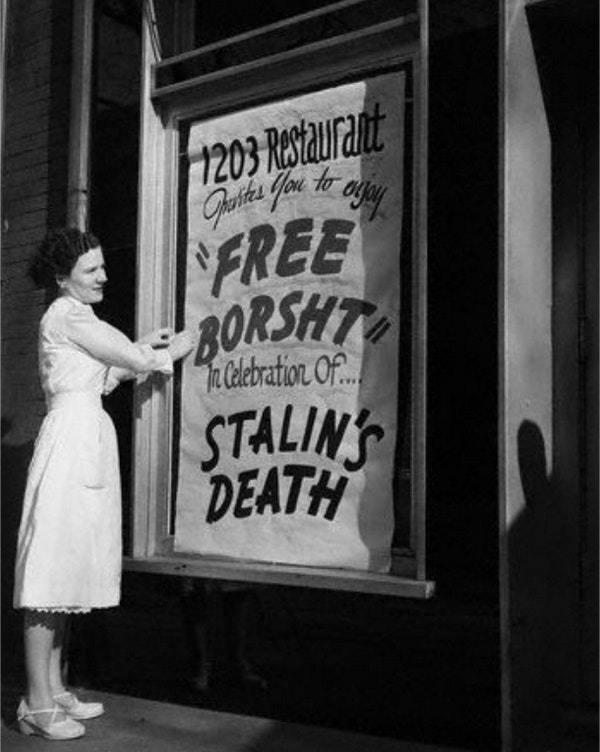 Μπορεί να ακούγεται παράξενο, αλλά κάποιοι άνθρωποι γιορτάζουν τον θάνατο. Αυτό συνέβη όταν πέθανε ο Ιωσήφ Στάλιν. Ο ίδιος υποψιάστηκε τον σχεδιασμό του Μεγάλου Λιμού που σκότωσε εκατομμύρια ανθρώπους. Έτσι, όταν ο Στάλιν πέθανε, όλοι έφαγαν δωρεάν σούπα Μπορς.