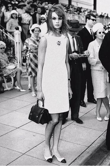 To μοντέλο Τζιν Σρίμπτον φοράει ένα κοντό φόρεμα στους αγώνες της Μελβούρνης. Η εμφάνιση της προκάλεσε πολλές αντιδράσεις ανάμεσα στους παρευρισκομένους, 1965.