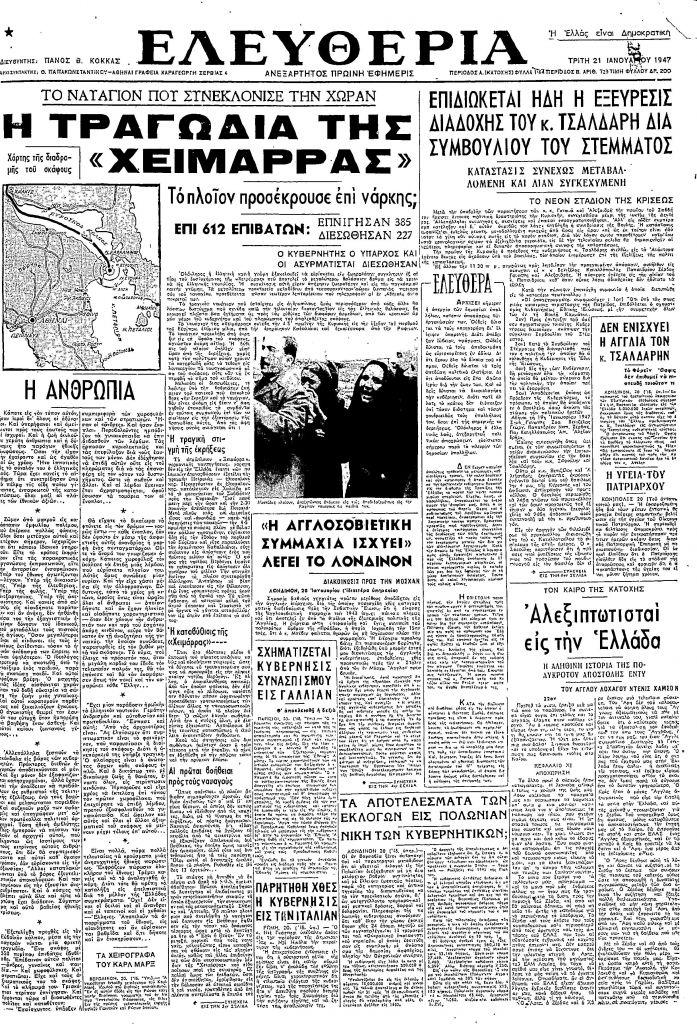 Το πρωινό της 19ης Ιανουαρίου του 1947, το ατμόπλοιο Χειμάρρα ξεκινά από το λιμάνι της Θεσσαλονίκης με προορισμό τον Πειραιά με 612 επιβάτες και πλήρωμα, ανάμεσα στους οποίους βρίσκονταν πολλές γυναίκες, παιδιά, πολιτικοί κρατούμενοι που εξορίζονταν και χωροφύλακες – συνοδοί αυτών.