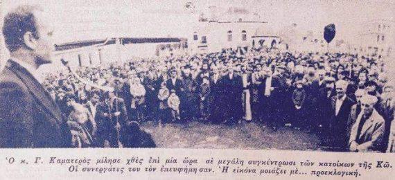 Οι εξελίξεις αυτές αποθρασύνουν περισσότερο τον Καματερό ο οποίος σε συγκέντρωση οπαδών του στο γήπεδο των Λιοσίων ανακοινώνει ότι θα πάρει την Πόλη, θα φέρει πίσω τον Βασιλιά, θα θέσει όρο για την παροχή νερού να πυρπολούν οι πελάτες – οπαδοί του τα γραφεία κομμουνιστικών εφημερίδων και θα υποχρεώσει τα 300 «κτήνη» της Βουλής να πιούν «ειδική κτηνιατρική έκδοση του νερού».