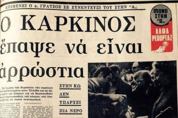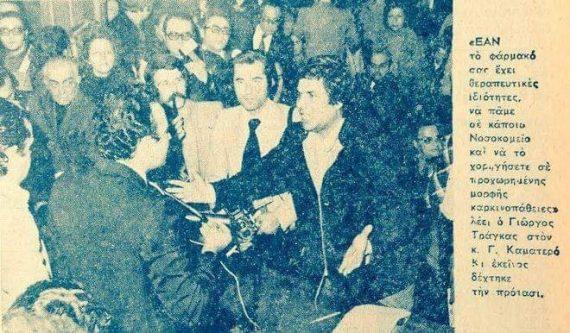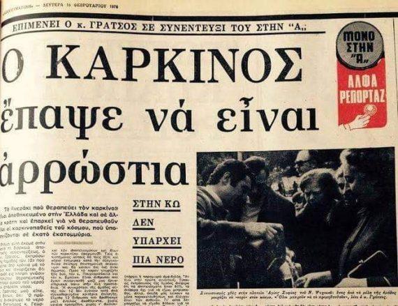 «Την 6ην Νοεμβρίου 1972, ομάς Ελλήνων Επιστημόνων ήχθη εις γνώσιν περί της απολύτου θεραπευτικής ικανότητος του παρουσιαζόμενου ύδατος επί της νόσου του καρκίνου.