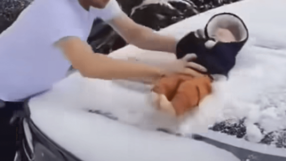 25χρονος πατέρας εθεάθη να χρησιμοποιεί το βρέφος του ως υαλοκαθαριστήρα κατά τη διάρκεια της άγριας χιονοθύελλας .Ο πατέρας καταγράφηκε να τρίβει το μωρό στο παρμπρίζ του αυτοκινήτου για να διώξει το χιόνι.