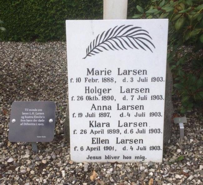 Η πινακίδα στα αριστερά αναφέρει: «Στη μνήμη των 5 παιδιών του Λ.Χ. Λάρσεν και της συζύγου του, Έμιλι, που πέθαναν από διφθερίτιδα το 1903.»