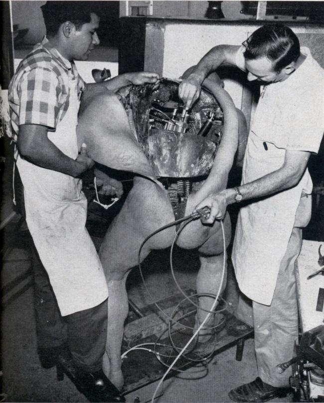 Μια φωτογραφία που απεικονίζει τους εργαζόμενους στα στούντιο της Ντίσνεϊ. Κατασκευάζουν έναν αυτοματοποιημένο άνθρωπο των σπηλαίων για την εκδήλωση της Νέας Υόρκης, το 1964.