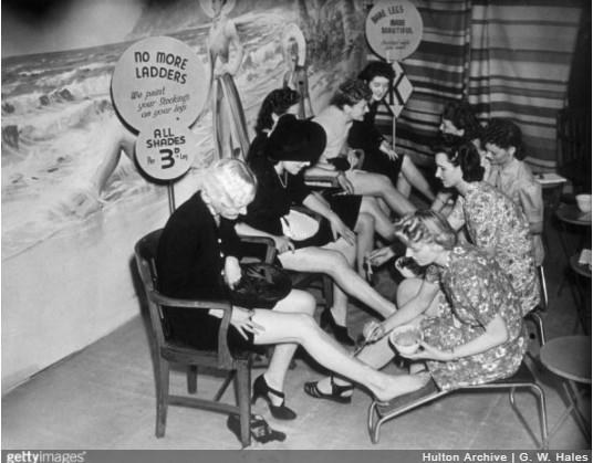 Υπάλληλοι βάφουν τα πόδια των πελατισσών σε ένα κατάστημα στο Λονδίνο, ώστε να μπορούν να κρατήσουν τα δελτία τους που διαφορετικά θα χρησιμοποιούσαν για κάλτσες, 1941.