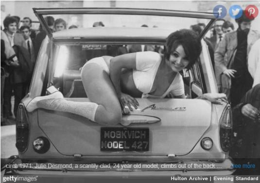 Το 24χρονο μοντέλο Τζούλι Ντέσμοντ, βγαίνει από το πίσω μέρος ενός ρωσικού αυτοκινήτου Moskvich 427, σε μια εμπορική έκθεση αυτοκινήτων, 1971.