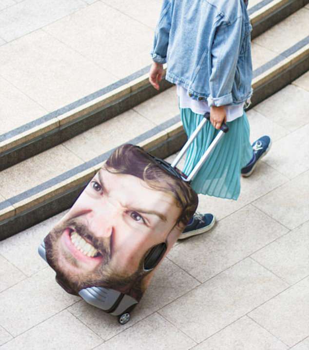 Ένας άντρας με το πρόσωπό του τυπωμένο πάνω στην βαλίτσα του.