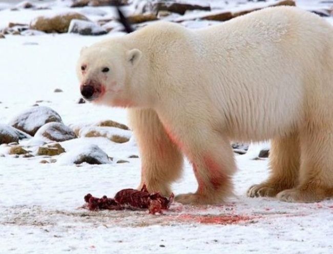 Οι ενήλικες πολικές αρκούδες, συνήθως τρώνε μόνο το δέρμα και το λίπος από τη λεία τους. Αφήνουν το κρέας για τα μικρά τους και τα άλλα ζώα. Είναι πραγματικά δοτικά αρπακτικά.