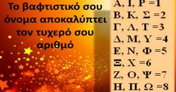 Ο αριθμός που προκύπτει από το βαπτιστικό όνομα είναι ένας τυχερός αριθμός και μπορεί να χρησιμοποιηθεί γενικά για οποιοδήποτε σκοπό και ειδικά στα τυχερά παιχνίδια.