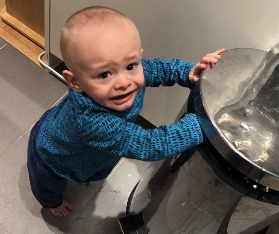 Ένα παιδάκι έκλεισε το χέρι του στον κάδο. Μάλλον όμως ο λόγος που είναι τόσο φοβισμένο δεν είναι ότι πονάει, αλλά ότι σκέφτεται ότι ο σατανικός κάδος που έχει το ύψος του, έχει βάλει στόχο να φάει το χεράκι του!