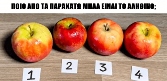 Στην φωτογραφία βλέπεις 5 μήλα. Κάποιο από αυτά τα μήλα όμως δεν είναι στην πραγματικότητα μήλο, αλλά κάτι άλλο; Μπορείς να μαντέψεις ποια από όλα αυτά τα μήλα, είναι το ψεύτικο;