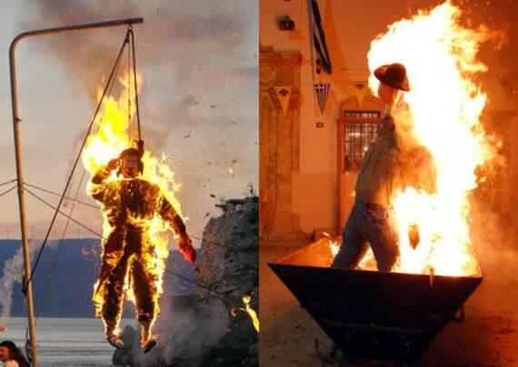 Το ανθρώπινο ομοίωμα, γεμισμένο με ξύλα και άχυρα, παραδίδεται στις φλόγες με φαντασμαγορικό τρόπο. Μαζί με την φωτιά ξεκινάει παράλληλα και ο χορός των βεγγαλικών.