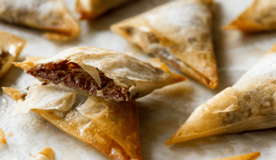 Εκτέλεση: Προθερμαίνετε το φούρνο στους 180⁰C βαθμούς. Λιώστε τη κουβερτούρα σε μπεν μαρί ή στο φούρνο μικροκυμάτων σε μεσαία ένταση (500W). Μέσα σε ένα μπολ ανακατέψτε τη λιωμένη σοκολάτα, το βούτυρο, τη ζάχαρη, την σκόνη αμυγδάλου και το αυγό. Βάλτε το φύλλο μπροστά σας οριζόντια. Κόψτε 4 λωρίδες και βουτυρώστε (με το επιπλέον βούτυρο). Φροντίστε να είναι καλυμμένα τα φύλλα που έχετε ανοίξει με μια νοτισμένη πετσέτα για να μην ξεραθούν. Πάρτε μια κουταλιά της σούπας από το μείγμα σας και τοποθετείστε το στο κάτω μέρος της λωρίδας. Διπλώστε το φύλλο τριγωνικά, έως πάνω. Την τελευταία άκρη βάλτε τη μέσα, για να αποφύγετε να φύγει η γέμιση. Ψήστε στο φούρνο σε αντικολλητικό ταψί για 10 – 15 λεπτά μέχρι να πάρουν ένα ωραίο χρυσαφί χρώμα. Η Συμβουλή του Σεφ: Μπορείτε να ετοιμάσετε περισσότερη ποσότητα και να τα βάλετε στην κατάψυξη στο στάδιο πριν το ψήσιμο. πηγη