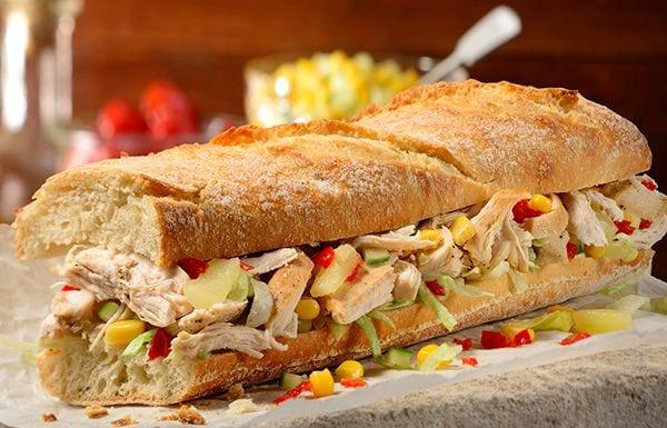 3. Λευκή μπαγκέτα με ψητό φιλέτο κοτόπουλο, ψιλοκομμένο λάχανο, αγγούρι, κόκκινη πιπεριά και καλαμπόκι. Χορταστικό και μπορείς να το πεις και light.