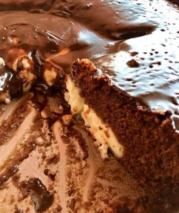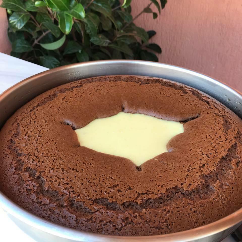 Κεικ κρατηρας Σοκολατένιο κεικ με κρεμα βανίλια ❤️ Υλικά για την κρέμα ·780 γάλα (4 φλιτζάνια) ·3 κουταλιές σούπας κορν φλάουερ η άνθο αραβοσίτου βανίλια ·2 κουταλιές σούπας αλεύρι γ.ο.χ ·5 κουταλιές σούπας ζάχαρη ·1 βανίλια για το κορν φλάουερ ·λίγο βούτυρο για το κέικ ·3 αυγά ·1 φλυτζ. ζάχαρη ·μισό φλυτζ. σπορέλαιο ·1 φλυτζ.γάλα ·3 κουταλιές σούπας κακάο ·1 φακελάκι μπέικιν ·2-2,5 φλυτζ. αλεύρι γ.ο.χ Εκτέλεση 1. Πρώτα ετοιμάζουμε την κρέμα. Ανακατεύουμε όλα μαζί χωρίς το βούτυρο. Βάζουμε στη φωτιά να βράσει, να αρχίσει να δένει. Στο τέλος ρίχνουμε το βούτυρο 2. Για το κέικ, χτυπάμε τα αυγά με τη ζάχαρη να αφρατέψουν. Προσθέτουμε το γάλα, το λάδι, το κακάο, μπέκιν και αλεύρι. Το μιγμα να είναι λίγο σφιχτό, όχι νερουλό 3. Ρίχνουμε το μίγμα του κέικ σε μια ταψάκι τσέρκι, αποσπώμενο 4. Στη μέση απο το μιγμα κέικ, ρίχνουμε την κρέμα. ΠΡΟΣΟΧΗ η κρέμα να μην είναι καυτή, γιαυτό την ετοιμάσαμε νωρίτερα! Επίσης η κρέμα πρέπει να αφήνει 3-4 εκατοστά κενό απ τα τοιχώματα για να μπορέσει να φουσκώσει το κεικ και να την κλείσει. 5. Ψήνουμε στους 180 για 40 λεπτά περίπου, να βγαίνει καθαρό το μαχαίρι όταν το βουτάμε στο κέικ. Αφήνουμε λίγο να κρυώσει, ξεφορμάρουμε και κόβουμε όταν κρυώσει εντελώς για να σταθεροποιηθεί η κρέμα! όχι οτι αν κόψετε ζεστό θα χαλάσει, ίσα ίσα ζεστό είναι όλα τα λεφτά!!
