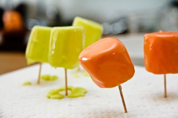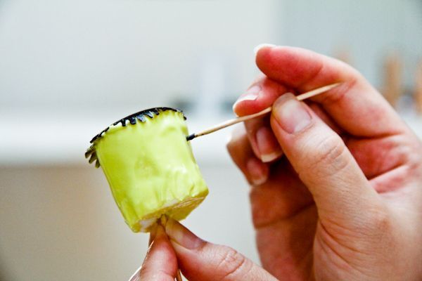Κάντε με το μαχαίρι μια μικρή εσοχή στο κέντρο.Γεμίστε με σοκολάτα και μετά φτιάξτε τα δόντια με icing.