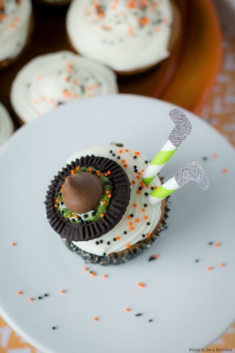 Για να κάνετε αυτά τα cupcakes θα πρέπει να σπάσετε ένα μπισκότο Oreo στη μέση. Στη συνέχεια τοποθετείται ένα σοκολατάκι στην κορυφή και το κολλάτε με ζελέ. Κόψτε ένα καλαμάκι και στην άκρη κολλήστε τα παπούτσια που έχετε φτιάξει από χαρτόνι!.