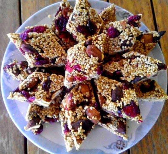 Υλικά και εκτέλεση : 200 γραμ μελι, 200 σουσαμι, μισο φλυτζανι βρωμη. 60 γραμ ταχινι.Καβουρδιζουμε λιγο το σουσαμι με μισο κουταλακι λαδι καρυδας, βραζουμε το μελι με το ταχινι κ μολις γινουν ενα και κρυωσουν ελαφρως προσθέτουμε το σουσαμι κ την βρωμη. Το στρώνουμε σε ενα ταψακι με λαδοκολλα που την εχουμε λίγο λαδώσει. Από πάνω βάζουμε αν επιθυμούμε αποξηραμένα φρούτα.