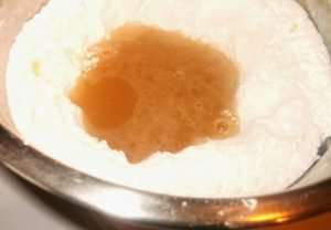 Ρίχνεις σε μια λεκάνη το υγρό, τις βανιλλίνες και σιγά σιγά ενσωματώνεις την υπόλοιπη ζάχαρη μέχρι να έχεις ένα ζυμάρι που να μην κολλάει στα χέρια.