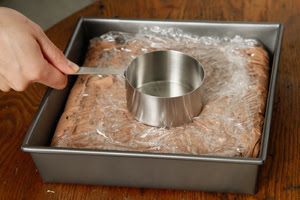 Μεταφέρετε το μείγμα στο ταψάκι και απλώστε . Το σκεπάζετε με τη μεμβράνη και το στρώνεται μεχρι να γινει ομοιομορφο.Μπορειτε και με ενα κατσαρολάκι όπως στη φωτο