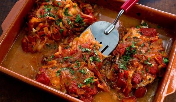 Μπακαλιάρος πλακί με κρεμμύδια, ντομάτες και σταφίδες