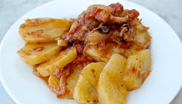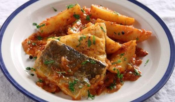 Μπακαλιάρος αγιορείτικος με πατάτες σε κόκκινη σάλτσα