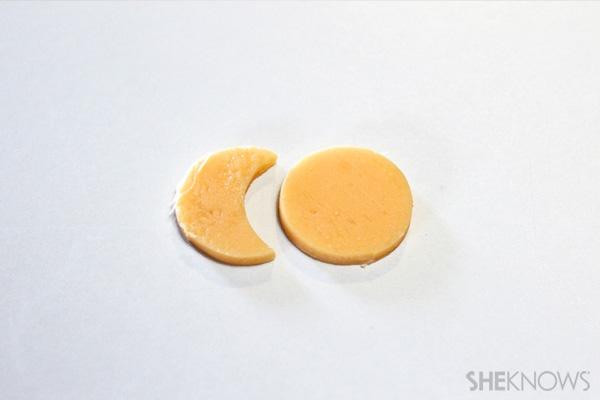 Για τα φτερά, κόβουμε ένα κύκλο του τυριού τσένταρ και ξανα-κόβουμε στη μέση.