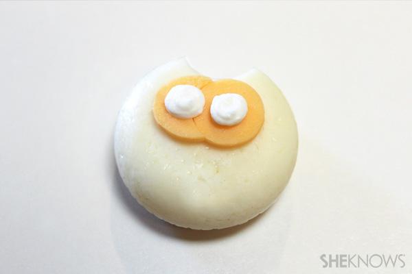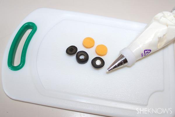 Φτιάξτε τα μάτια με τυρί κρέμα και προσθέστε μια μαύρη κουκκίδα με μαρκαδόρο ειδικό για τρόφιμα.