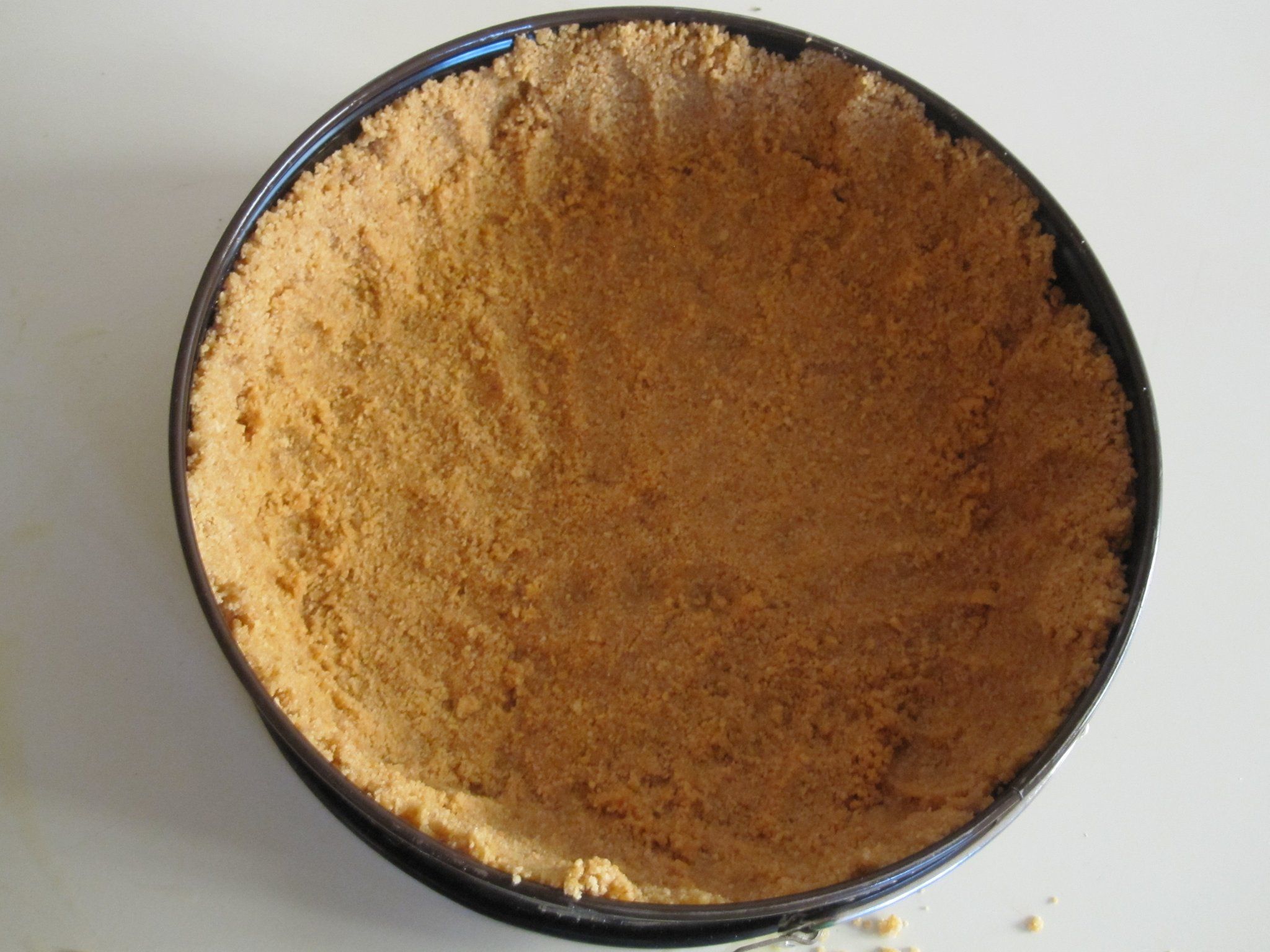 Σε μια πλαστική σακούλα, βάλτε όλα τα μπισκότα και χτυπήστε τα στον πάγκο της κουζίνας μέχρι να θρυματιστούν. Έπειτα, ρίξτε σε ένα μπολ μαζί με τη ζάχαρη και το λιωμένο βούτυρο και ανακατέψτε τα.