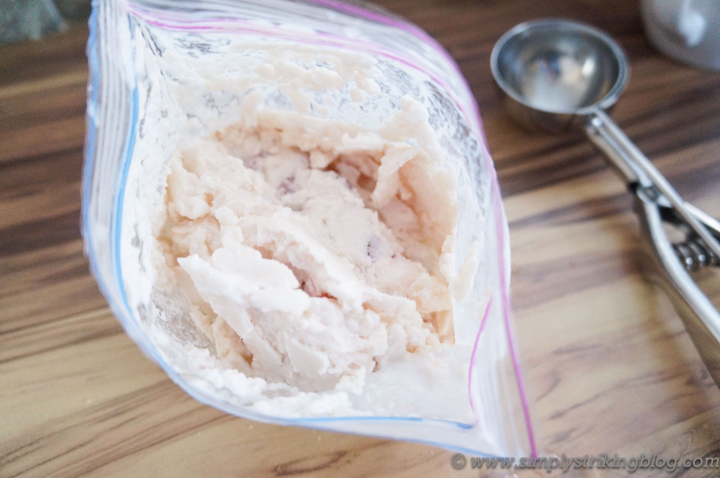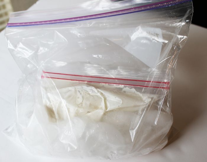 Χτυπήστε την συνεχόμενα για 5 λεπτά. Τότε, θα δείτε ότι το μίγμα έχει γίνει παχύρρευστο. Χωρίς να ανοίξετε τις σακούλες, αφήστε τις να «ξεκουραστούν» σε ένα πιάτο ή μια πετσέτα για λίγα λεπτά, φροντίζοντας ο πάγος στη μεγάλη σακούλα να «περικλείει» τη μικρή σακούλα.