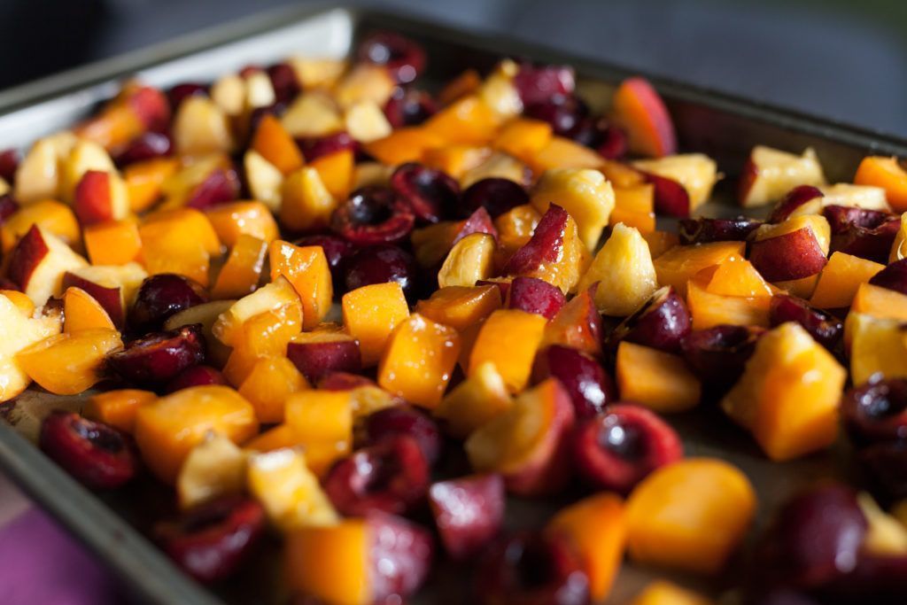 Έπειτα, τοποθετήστε τα κομμάτια των φρούτων σε ένα ταψί, αφήνοντας μια μικρή απόσταση μεταξύ τους για να μην κολλήσουν και ρίξτε από πάνω τον χυμό. Μπορείτε να τα κόψετε στη μέση, σε σχήμα μισοφέγγαρου ή ακόμα και σε κυβάκια. Στο τέλος, πασπαλίστε με το μίγμα από τη ζάχαρη και τα μπαχαρικά.