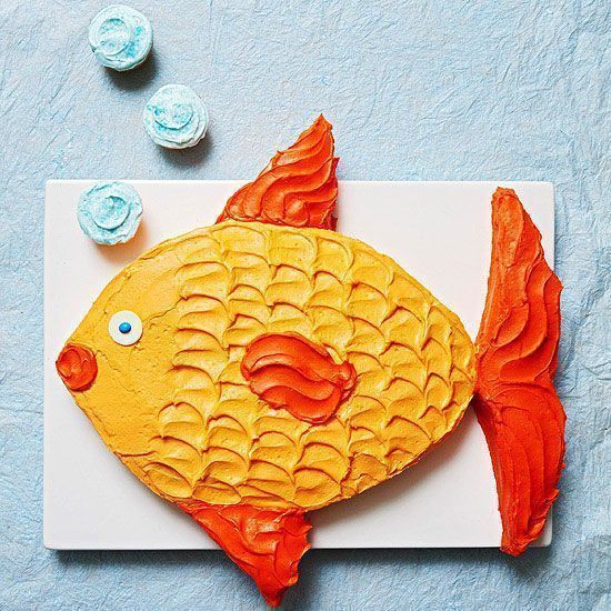 - Χρωματίστε τα 3/4 της βουτυρόκρεμας με πορτοκαλί χρώμα και στρώστε την στην κορυφή και τις πλευρές του οβάλ κέικ. Ανακατέψτε την υπόλοιπη βουτυρόκρεμα με κόκκινο χρώμα και στρώστε την στα πτερύγια και την ουρά. Χρησιμοποιώντας μια λεπτή μεταλλική σπάτουλα, κάντε σχέδια για να μοιάζουν με λέπια. Για τα μάτια, βάλτε την μπλε καραμέλα καραμέλα στην τούρτα.