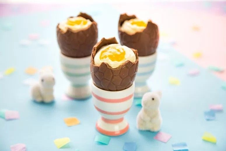 Προσεκτικά με ένα κουτάλι ή κορνέ γεμίζετε τα σοκολατένια αυγά. Αφήνετε τα γεμιστά αυγά στο ψυγείο μέχρι να πήξει καλά η κρέμα. Για να φτιάξουμε τον «κρόκο αυγού» θα ζεστάνουμε σε χαμηλή εστία σε μια κατσαρολίτσα τη μαρμελάδα βερίκοκο μαζί με λίγο βούτυρο και τον χυμό πορτοκάλι μέχρι να γίνει ένα ομαλό μείγμα. Στη συνέχεια κατεβάζουμε από την εστία και αφήνουμε να κρυώσει καλά μέχρι να πήξει λίγο.