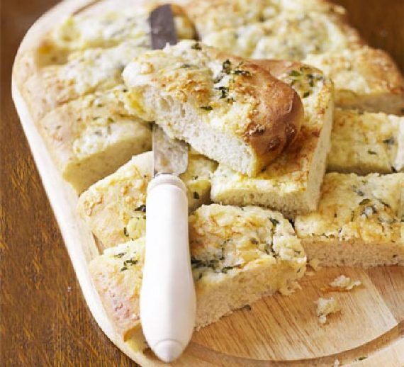 500 γρ. αλεύρι για ψωμί 1 φακελάκι ξερή μαγιά 1 κουταλάκι αλάτι 2 κουταλιές ελαιόλαδο 1 κουταλιά μέλι 300 ml χλιαρό νερό 2 σκελίδες σκόρδο πολτοποιημένες 30 γρ. βούτυρο μαλακό 200 γρ. φέτα 1 κουταλιά φύλλα από φρέσκο θυμάρι