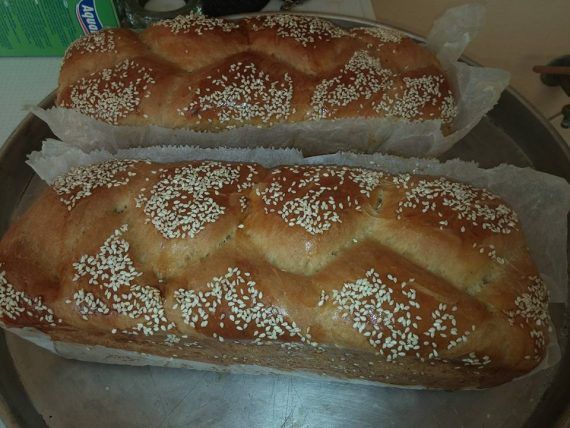 Στο τελος εριχνα το αλευρι σιγα σιγα και ζυμωνα μεχρι να γινει μια ευπλαστη ζυμη να μην κολλαει στα χερια! Αφησα το ζυμαρι να διπλασιαστει! Το ζυμωσα μια φορα και το αφησα παλι να διπλασιαστει! Οταν ηταν πλεον ετοιμο το χωρισα σε μπαλακια και εκανα 2 μεγαλες πλεξουδες . τις εβαλα στη φορμα με λαδοκολλα!