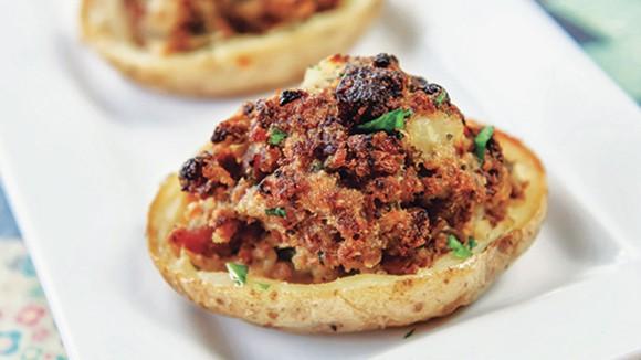 Ψήνετε σε αλουμινόχαρτο ολόκληρη την πατάτα μέσα στον φούρνο, με τη φλούδα. Όταν είναι έτοιμη, την ανοίγετε στα δυο, αδειάζετε λίγη από την ψίχα και προσθέτετε κιμά, μυρωδικά και τριμμένο τυράκι. Ψήνετε για 5-8 λεπτά στον φούρνο.
