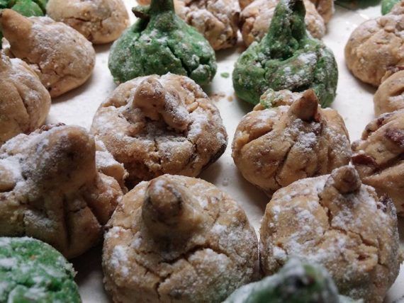 Στη συνεχεια τη βγαζω απο το ψυγειο και το χωριζω σε δυο μερη! Στο ενα βαζω χρωμα ζαχαροπλαστικης πρασινο για να κανω τα φρεσκα συκα και το αλλο οπως εχει! Δημιουργω μικρα μπαλακια σαν καρυδια! Δινω το σχημα του συκου και ψηνω στους 180 β για 25 λ Οταν κρυωσουν βαζω αχνη! Ειναι πολυ νοστιμα και εντυπωσιακα!