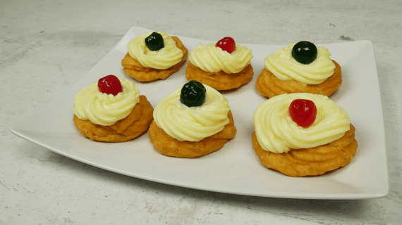 Σε αντικολλητικό χαρτί κάνουμε δύο κρίκους τον ένα πάνω στον άλλο. Κόβουμε το αντκολλητικό χαρτί και τηγανίζουμε σε καυτό ηλιέλαιο. Όταν η ζύμη ασπρίσει αφαιρούμε το αντικολλητικό χαρτί. Μόλις πάρουν χρώμα από την μία πλευρά τα γυρίζουμε από την άλλη. Όταν έχουν ροδίσει τα βγάζουμε σε απορροφητικό χαρτί. Τοποθετούμε κρύα κρέμα από πάνω και σερβίρουμε μαζί με ένα κεράσι.