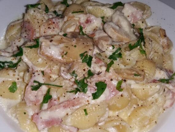 Συνταγή για αχιβάδες με κρέμα γάλακτος, σαλάμι αέρος, μπέικον, μανιτάρια και τυριά που λιώνουν για ένα εύκολο και γρήγορο μεσημεριανό ή βραδινό.