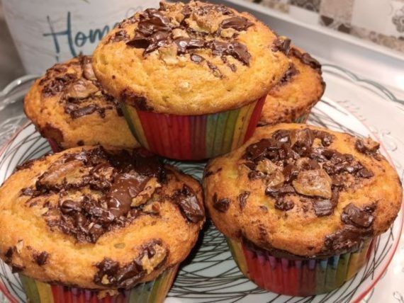 Μοιράζουμε το μείγμα σε θήκες για muffins και βάζουμε από πάνω από λίγες σταγόνες σοκολάτας. Ψήνουμε στους 170 βαθμούς Κελσίου, στις αντιστάσεις, μέχρι να φουσκώσουν καλά.