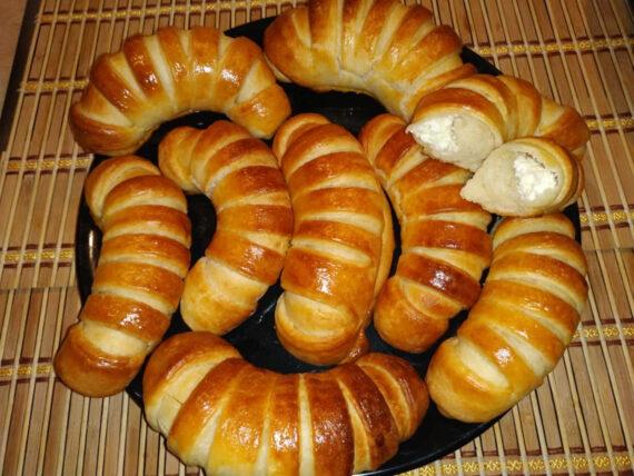 Σε μία λεκάνη προσθέτουμε το χλιαρό γάλα, το ηλιέλαιο, την ζάχαρη, το αλάτι, την φρέσκια μαγιά, τα ασπράδια και το αλεύρι για όλες τις χρήσεις. Ανακατεύουμε και πλάθουμε πολύ καλά μέχρι να πάρουμε μία μαλακή ζύμη.